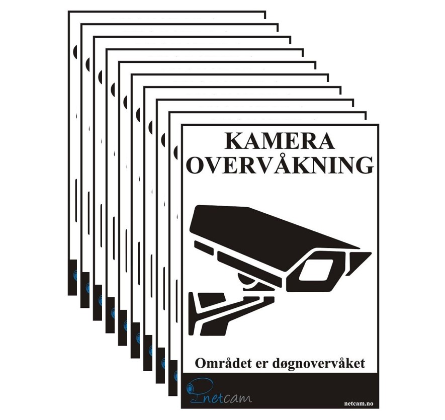 Dobbelsidig og selvklebende vinyl kameramerke med teksten “KAMERAOVERVÅKNING” 21 x 10 cm. Dobbeltsidig med bilde på begge sider. Kan brukes innendørs og utendørs.