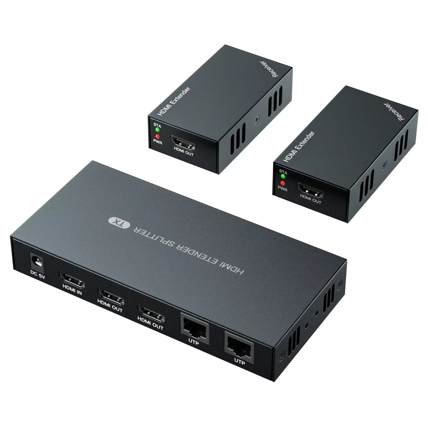 Sett med en sender og to mottaker av HDMI videosignal over vanlig nettverkskabel cat6 / cat5. Denne har i tillegg 2 HDMI-utanger fra selve splitteren. Den kan altså splitte HDMI-signatlet til 4 skjermer (to via HDMI og to via UTP). Kan sende opptil FULL HD 60 meter.